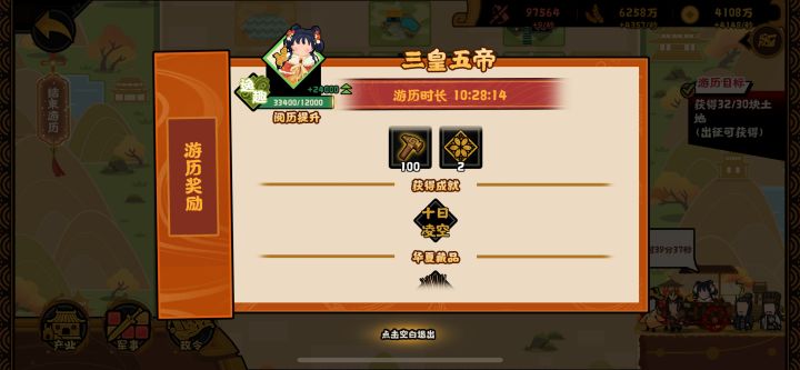 因为刚入坑,名臣等级星级都很低,几乎没有加成。而且相比起春秋战国,三皇五帝快一点,30地图就可以结束,确实刷得快了很多,可以早点拿到项羽。