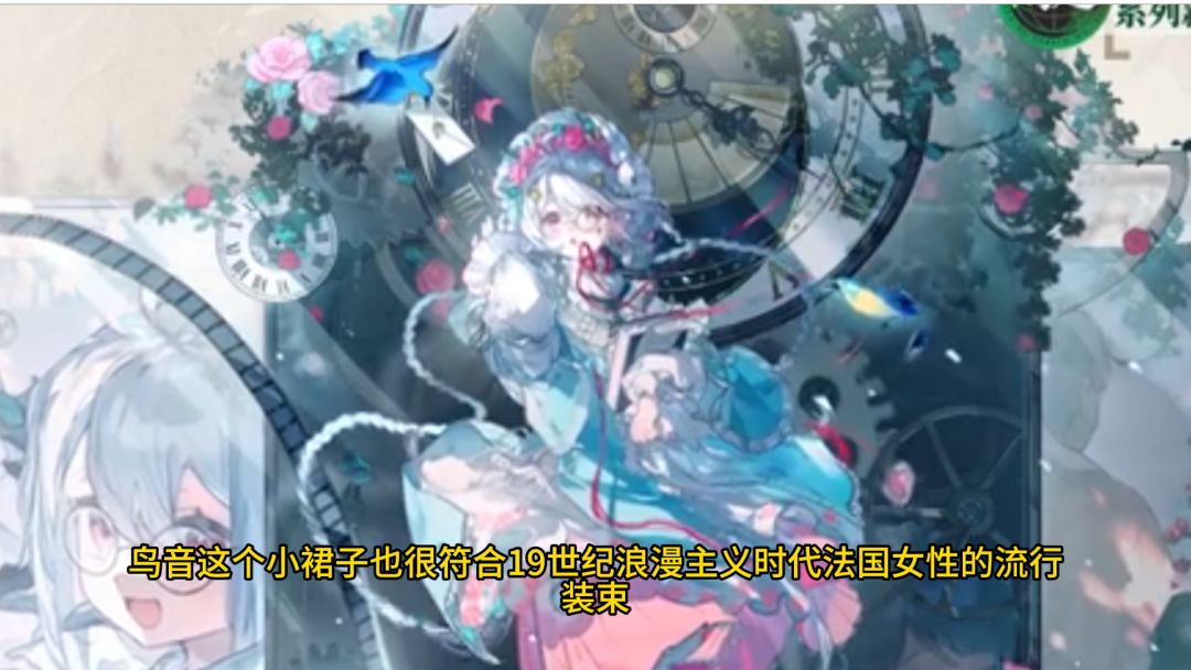 最后就是中间的、不是被封印在胶片里的记忆,而是实体的站在台前的小裙子鸟音。左边这个小鸟叼着信,不知道这个是不是设计的谁邀请鸟音来拍电影,等衣装介绍出来就知道了。鸟音这个小裙子也很符合19世纪浪漫主义时代法国女性的流行装束。我讲一下具体是什么,大家可以自己对一下。
