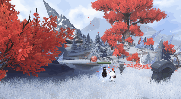 进入雪山村首先就能感受足下纤柔的冰草如月光淬炼的银针,凝着细雪编织成绒白的地毯向远方延展。在风雪中依旧傲立的红元宝树为这片雪地上添加了别样的生机。