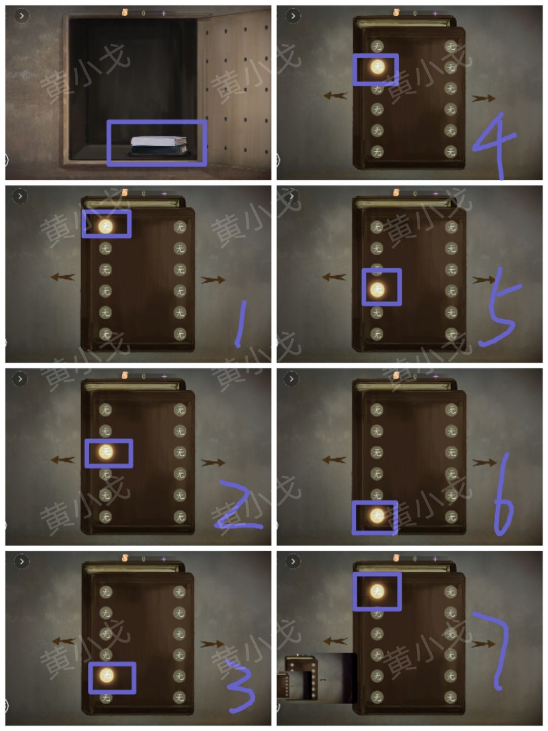 1.点击书,观察左侧无字闪烁顺序