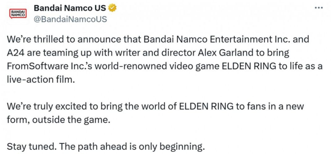 近日,万代南梦宫宣布,将与《美国内战》导演Alex Garland和A24工作室合作推出《艾尔登法环》。不过电影的剧情、演员阵容和上映日期尚未公布。