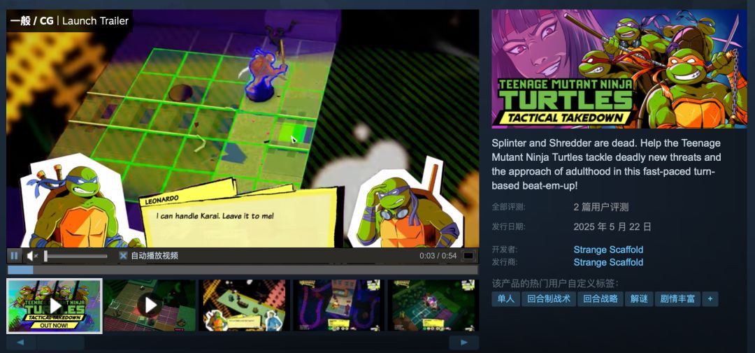 经典动画《忍者神龟》改编新游《忍者神龟:战略突击》发售,当前Steam售价68.4元。本作玩法方面并没有采用以往的爽快的动作类型,而是首次采用了SLG策略玩法,玩家将在游戏中体验到充满深度的战略玩法,也是别有一番乐趣。不过本作尚未支持中文语言。