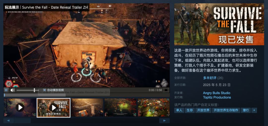 《秋末求生》是一款沙盒生存建造游戏,本作支持中文,首发八折限时优惠售价95.2元。本作讲述了地球因为巨大的陨石降落造成文明毁灭,多年过去因为极端的气候变动地球环境逐渐恢复居住,玩家需要在游戏中在安全地带建立聚居地,组建队伍,收集资源,建设生产,建立文明,对抗外敌,在这个崩坏世界中尽力求生。