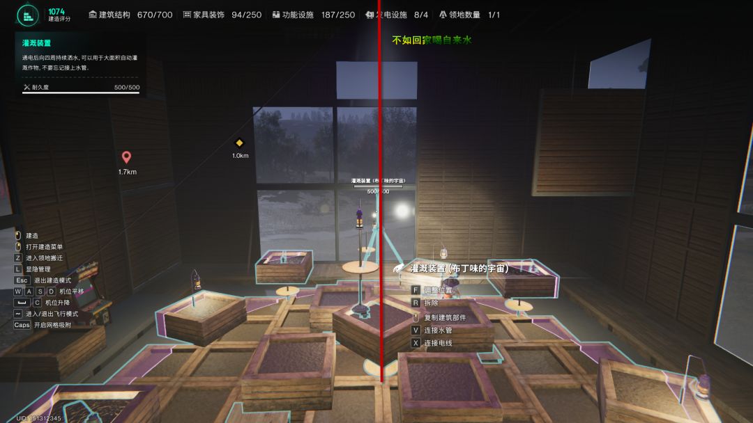 灌溉装置在中心红线附近,绝对不能与中心红线重合,不然灌溉装置下方的种植箱照不到光照(最耗时)
