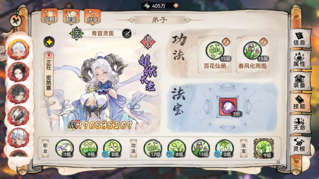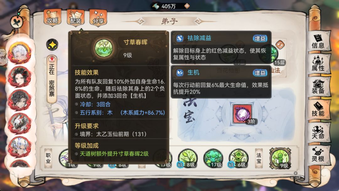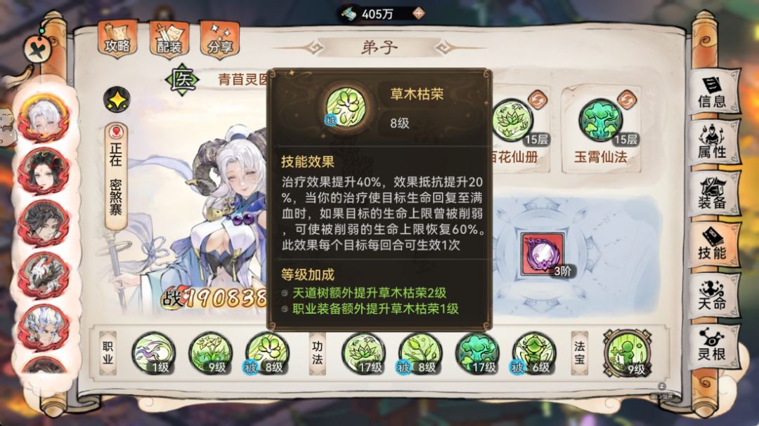 10:功法选择,首先苜蓿“专属”功法:百花仙册,必须安排上,这是苜蓿体系的核心功法,不管仙魔都是必带的。然后可以根据你队伍进行另外一个功法调整,如果是上毒效率来说,魔苜蓿我这边给大家推荐的是:春风化雨图。其他备选可以带:玉箫仙法,风灵歌诀,松风书录等等。