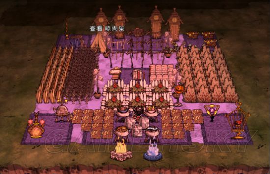 接下来就是造晒肉架和农场了。平时玩的时候我的习惯是移植和造晒肉架农场是同时的,晒肉架比农场先开始弄一点,确保肉干多一点好打BOSS。第一个农场贴着锅做,在中心线的位置上。然后其他的农场贴着这个农场造,总共六个。是有点少了,但是我们只有一个灭火器,所以将就下吧。