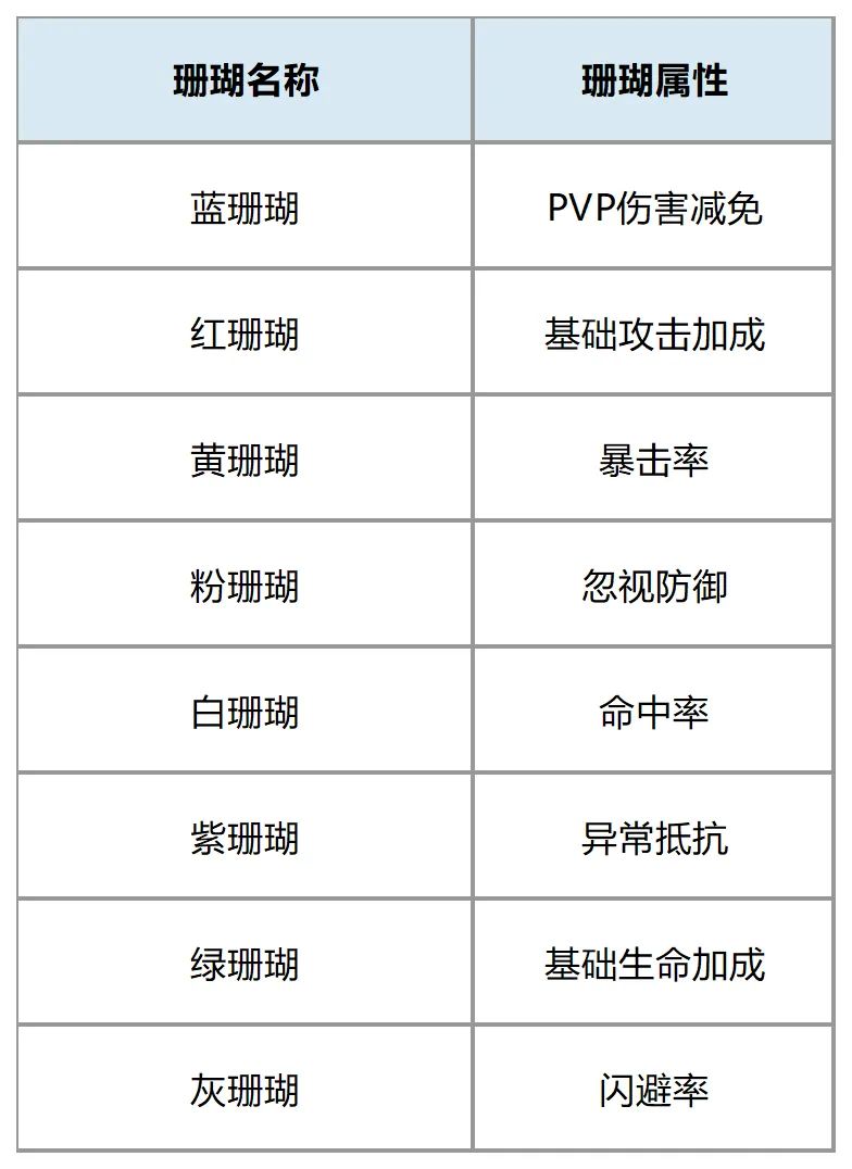 总共有8种类型的珊瑚,通关勇闯珊瑚海可以获得随机的1级珊瑚,使用珊瑚+泪海珍珠可以提升珊瑚等级,在全新的“泪之海”地图挂机(勇闯珊瑚海副本开启后)可以获得泪海珍珠。目前所有珊瑚最高可升至3级。若所获得的珊瑚并不是想要的,还可以分解珊瑚获得珊瑚碎片,使用珊瑚碎片可以合成1个指定的珊瑚。