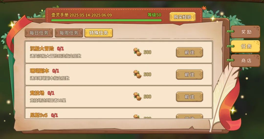 (1)壶灵手册特殊任务:通关沉船大冒险第5层,获得500手册经验