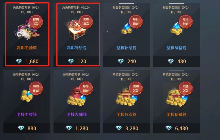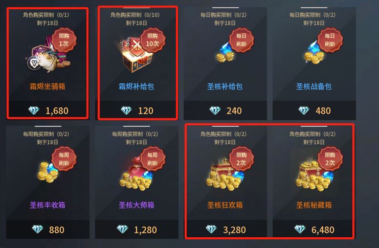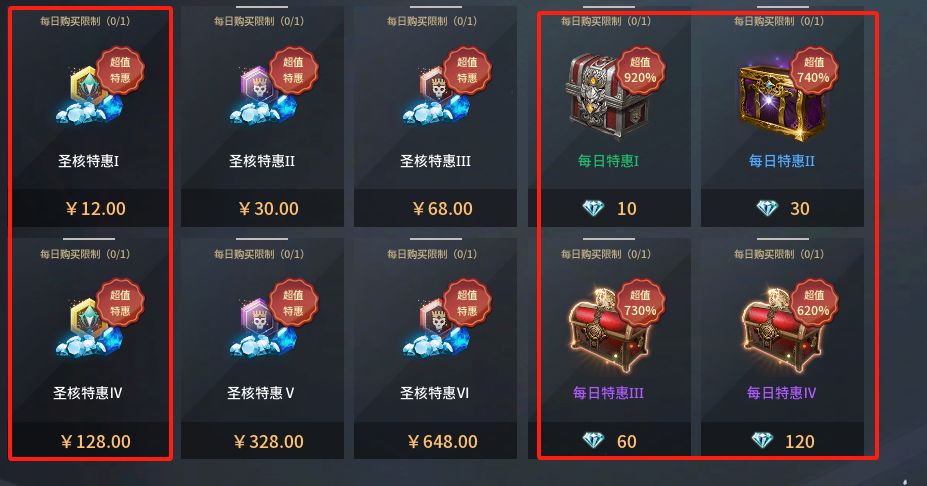 土豪玩家:首冲+通行证+月卡+各种限时礼包+每日必买+新手福袋+圣核共鸣+节日限定礼包