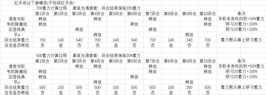 备注:唐蝶衣紫色天命额外释放满堂华彩能吃到自身华彩效果:+50%蓄力,故额外释放的技能蓄力为:200+200*50%(不计入仙三灵动+30%蓄力)=300蓄力,计入仙三灵动则为:200+200*(50%+30%)=360蓄力