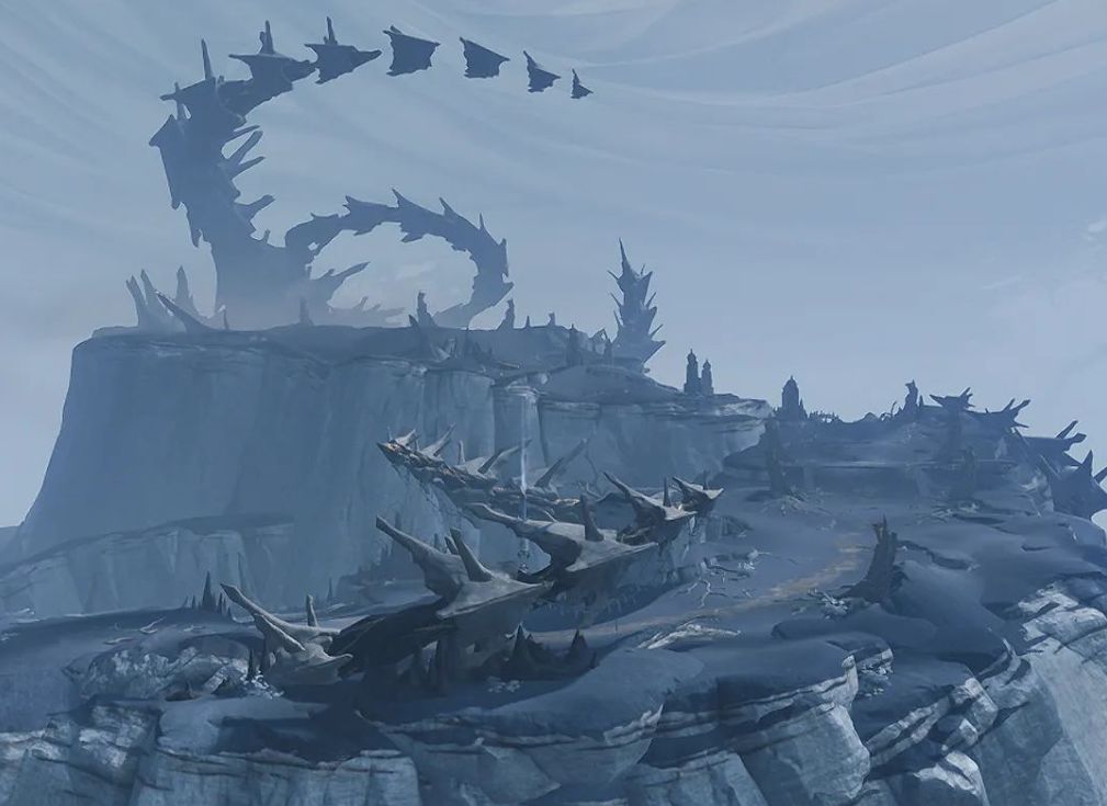 环境叙事同样是《鸣潮》的强项。游戏中的场景并非简单的背景板,而是承载着历史记忆的载体。在悲叹墓岛的演绎中,场景设计营造出的氛围感让玩家仿佛置身于一个充满绝望与哀伤的世界。踏入悲叹墓岛,首先映入眼帘的是断裂的嗟叹长阶,曾是连接外界与墓岛的希望之路却成为无法逾越的断壁,象征着流放者与外界的隔绝,给人一种无助与孤独的感受。船葬滩上,沉船的船骸在洋流中搁浅,诉说着曾经的灾难。船首祭地广袤荒凉,充满死亡的气息,巨大的遗骨随处可见。通过地貌环境,展现了黎那汐塔“黑潮”爆发后悲叹墓岛的残破与哀怨。