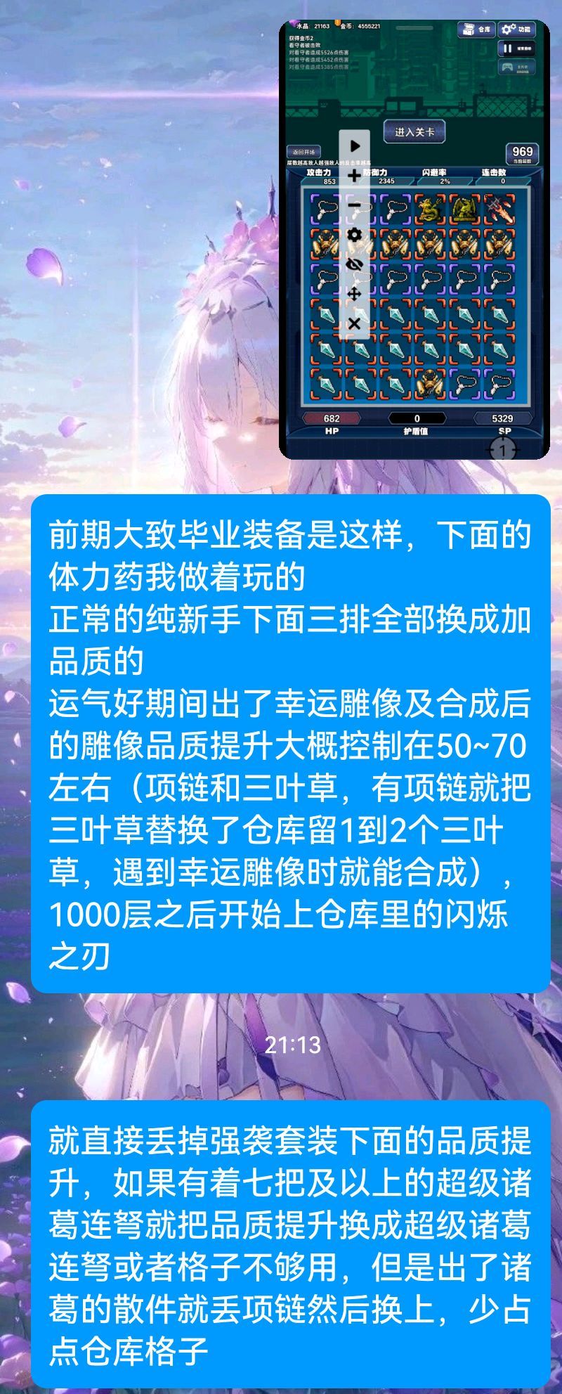 开局预留的装备:图一图二图3分别对应着第三张图合成要的装备,后面保证存活的装备。至少要做够进战斗100%的白字闪避期间有着龙神雕像(图二的装备摆放合成一个女神雕像,合成龙神要两个)可以减少闪烁之刃的数量
