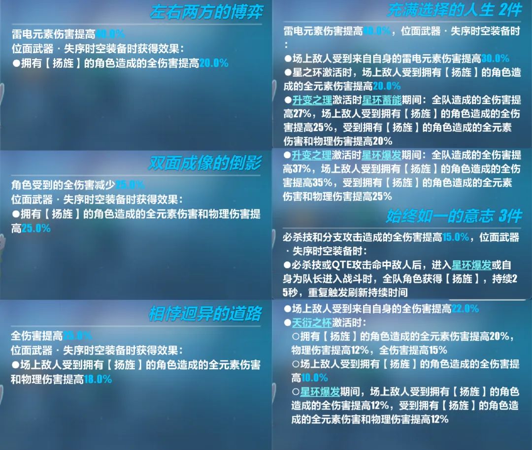 除了提升雷电伤害、全伤害等加成外,赫丽娅必杀技/qte命中敌人、进入星环爆发或作为队长进入战斗时,会赋予全队【扬旌】状态。敌人会获得大量易伤,我方拥有【扬旌】的角色也会获得全元素和物理伤害提升等加成。