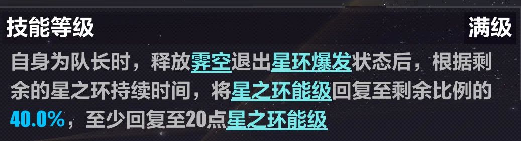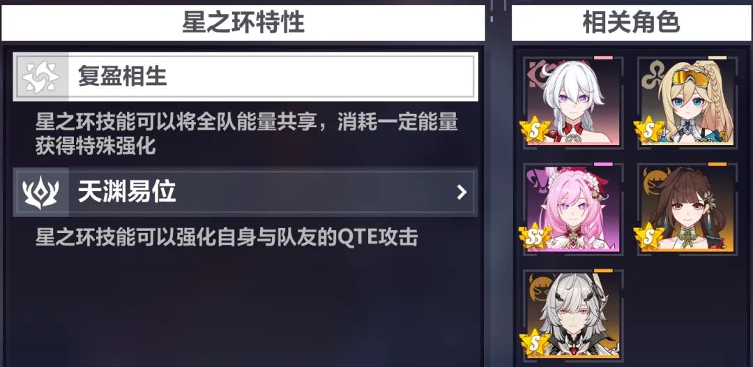 开启星之环后,全队角色会共享能量,能量条上限为全队角色能量条上限之和,且拥有大量初始能量。而队伍中作为辅助的【复盈相生】角色,在qte入场后,下一次必杀技的开启与能量消耗降为0。