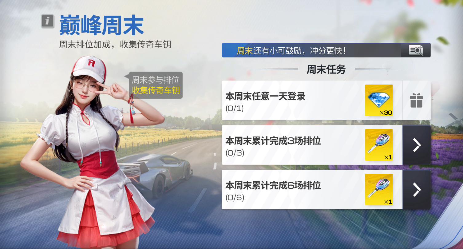 结尾:小可带着周末祝福来贴贴,排位冲分buff已经为大家拉满,还有钻石和传奇车钥奖励千万不要错过哟!
