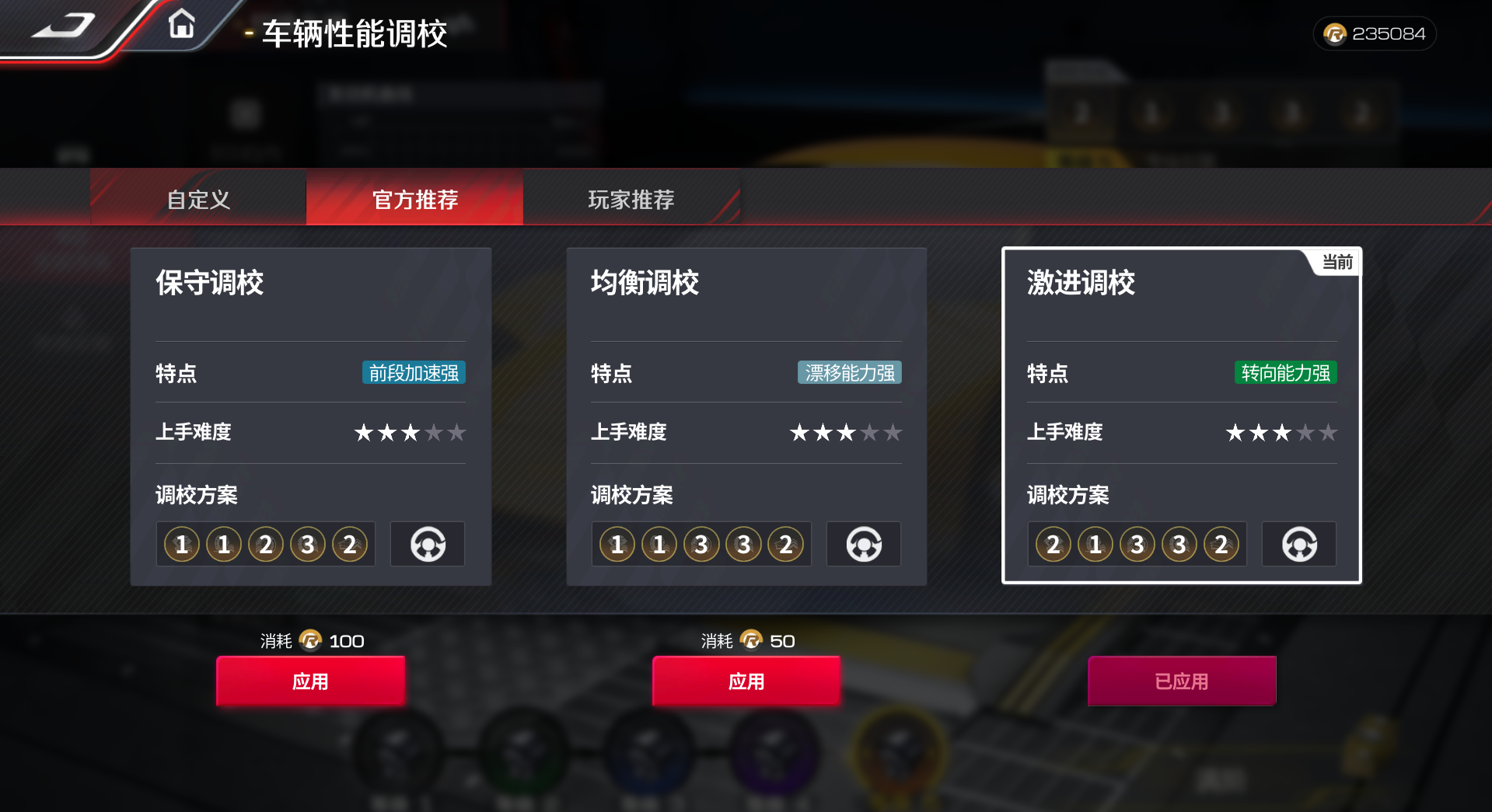在调校方面,小可所尝试的就是官方推荐方案中的激进调校方案【21332】,能够更好的发挥出转向能力强的优点,大家也可以选择其他调校方案并进行试驾,争取在赛道上获得更好的成绩哟~