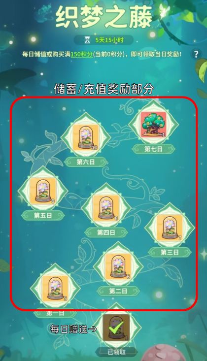 1.织梦之藤:每日充值/消费达到指定积分,可领取丰厚奖励。