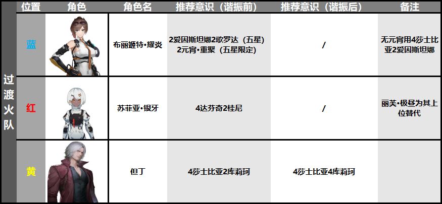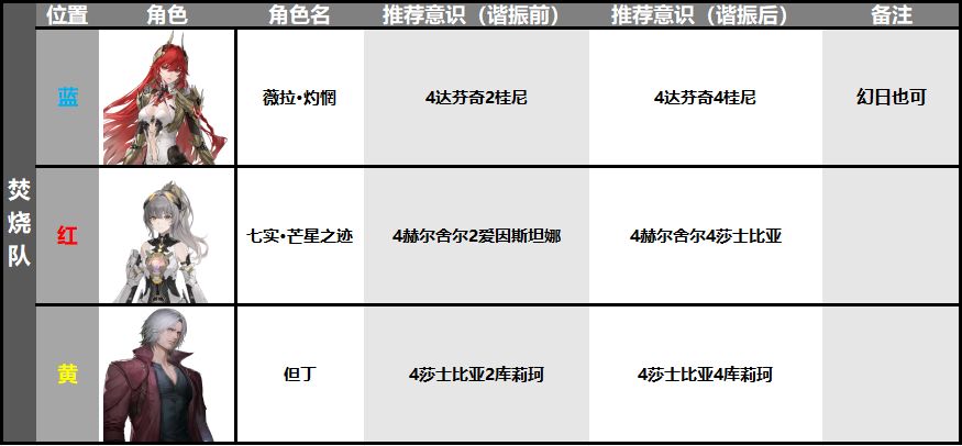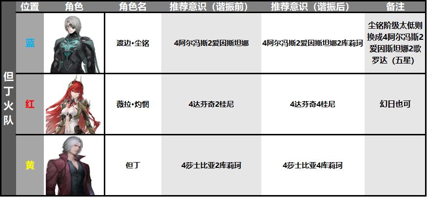 组成成员为:但丁、尘铭、灼惘,此火队上限不如同阶以誓焰为核心的火队,搭配推荐如下
