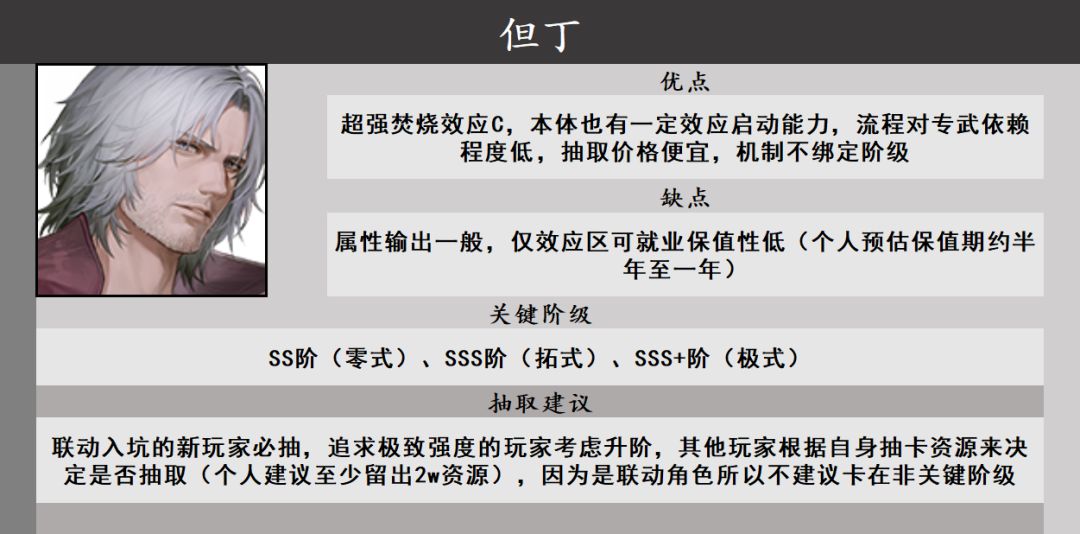 但丁比较值得在意的地方是保值性问题,但丁在本体属性,即火属性方面表现一般,上限不如以誓焰为核心的战双本家火队,仅能在焚烧环境上岗,未来是有可能被新出的C位替代的,不过但丁好就好在免费获取且造价便宜