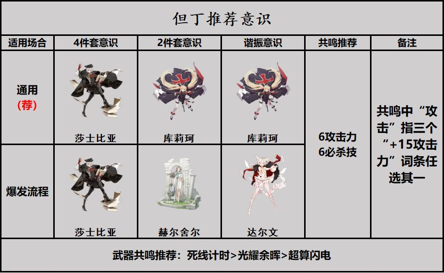 总的来说推荐但丁携带意识为4莎士比亚4库莉珂,意识共鸣推荐6攻击6必杀技
