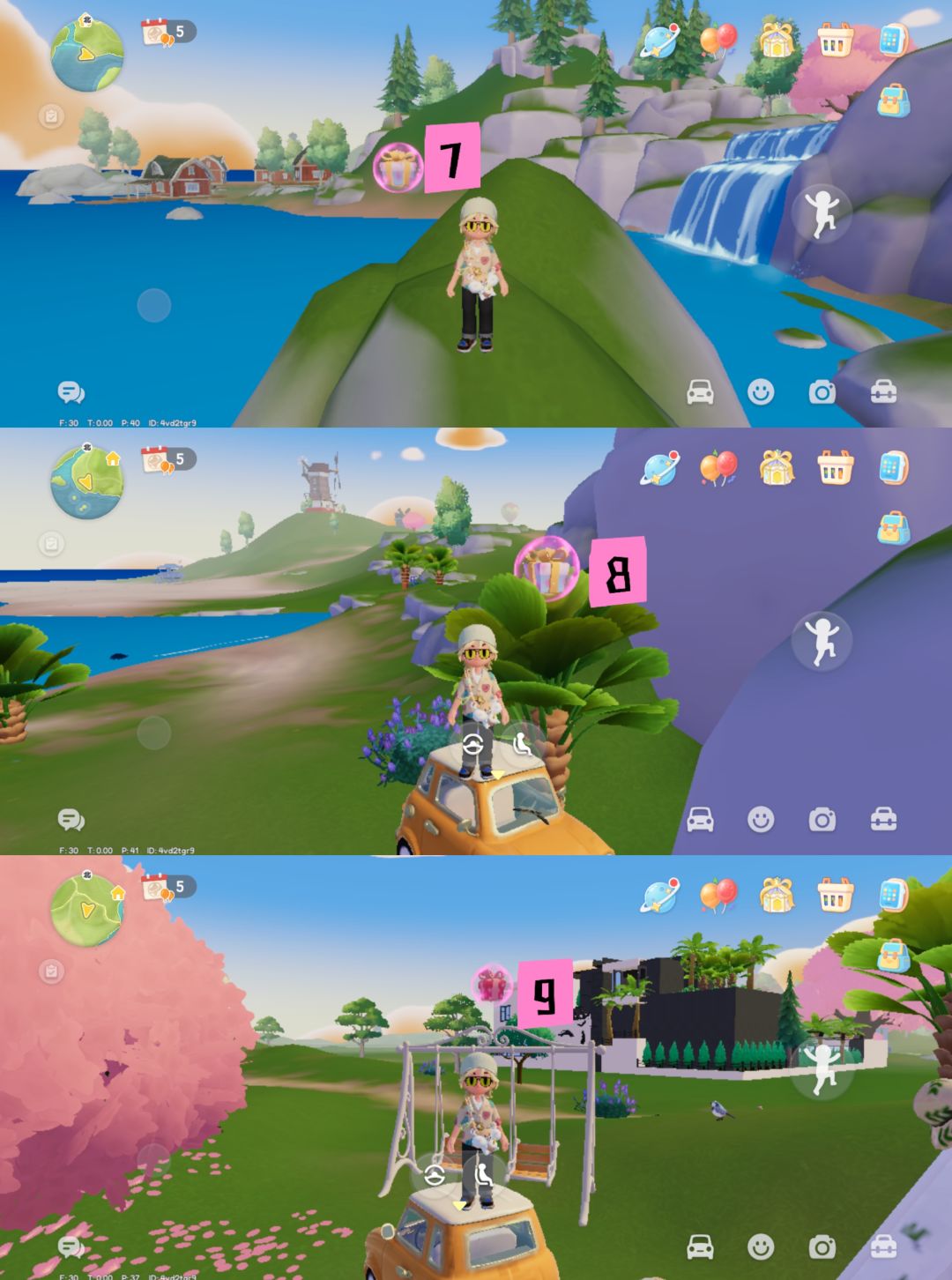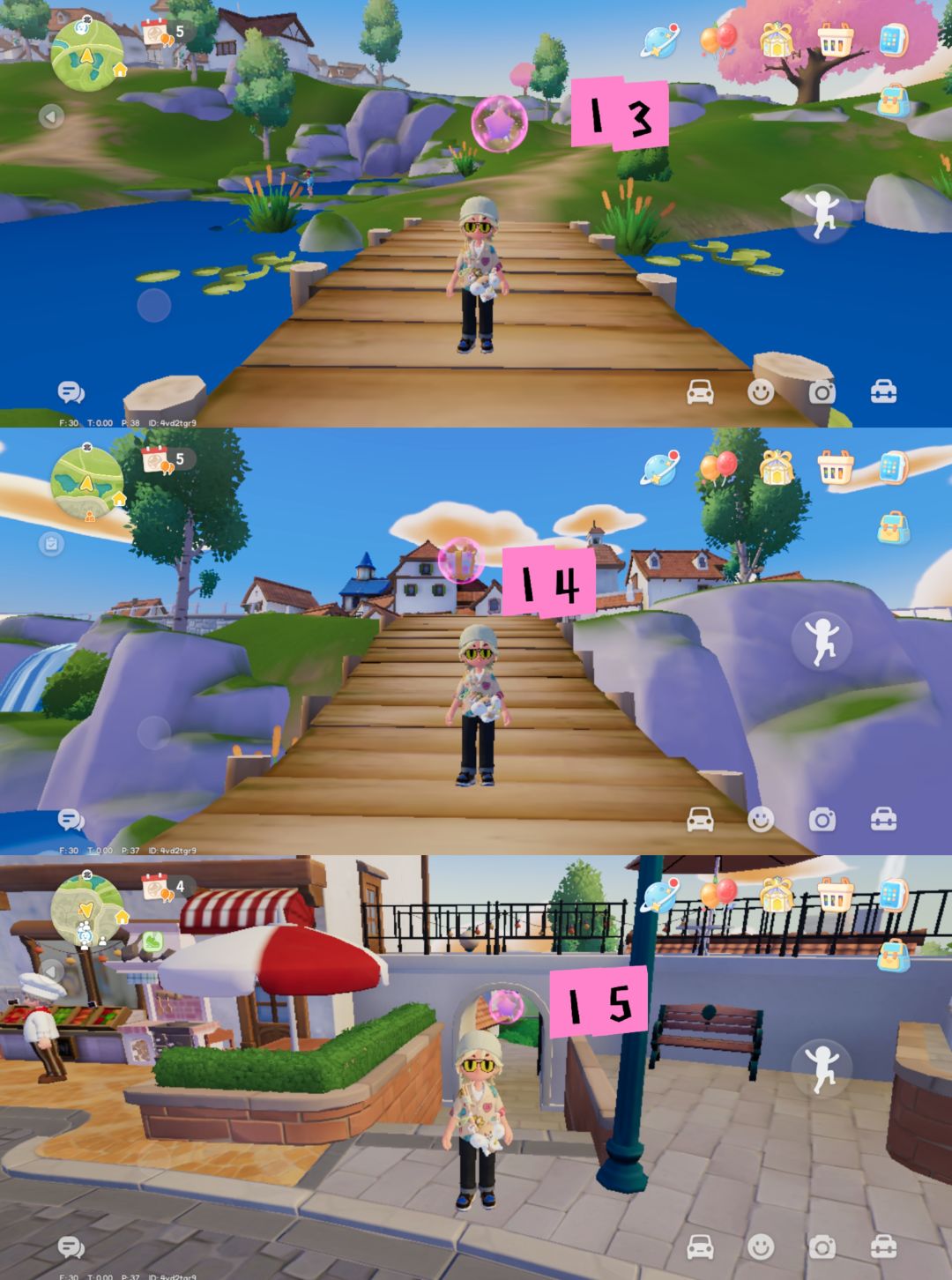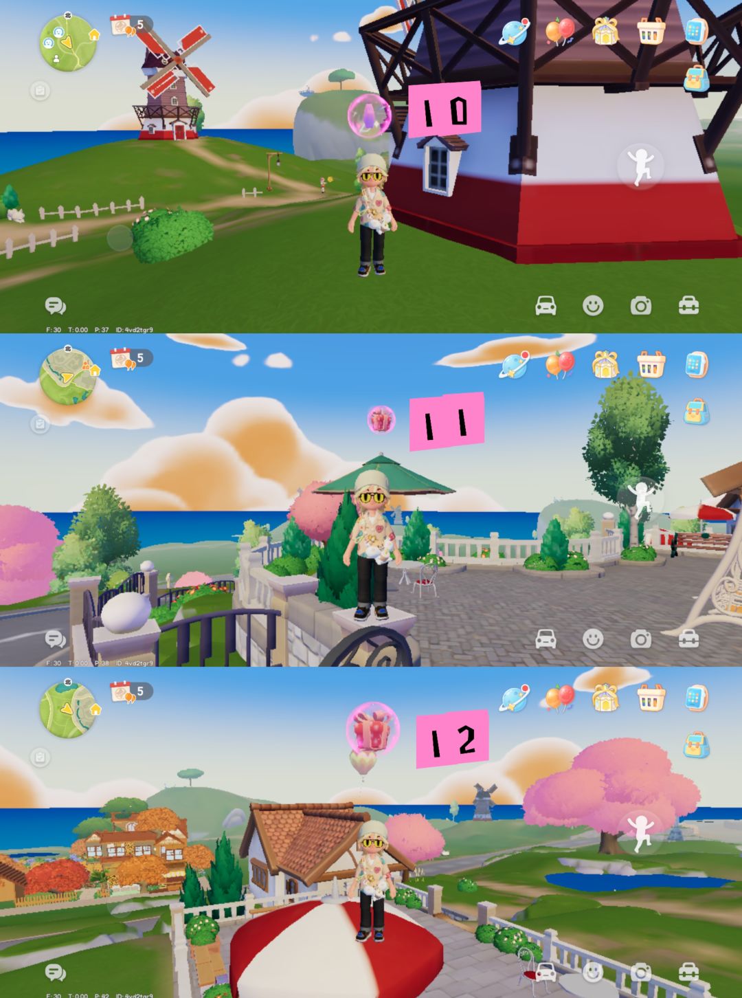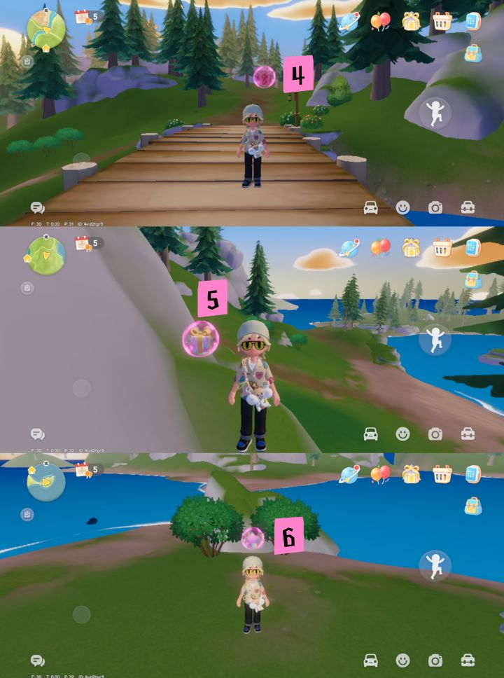 粉红泡泡位置分布:图一地图的爱心标记(15处),分别在温泉山3处,森林4处,小镇中心5处,花田2处,渔村1处。