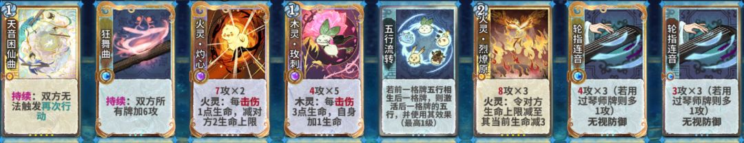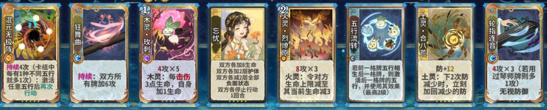 需要特别注意的是不上灵气牌情况下,这套卡组的灵气其实非常紧缺,我们的灵气只有开局激活的1灵和每回合使用非五行牌的1灵。要注意好非五行牌在卡组中的配合,以及考虑好是一圈速杀,还是计算好灵气,防止第二圈卡灵。