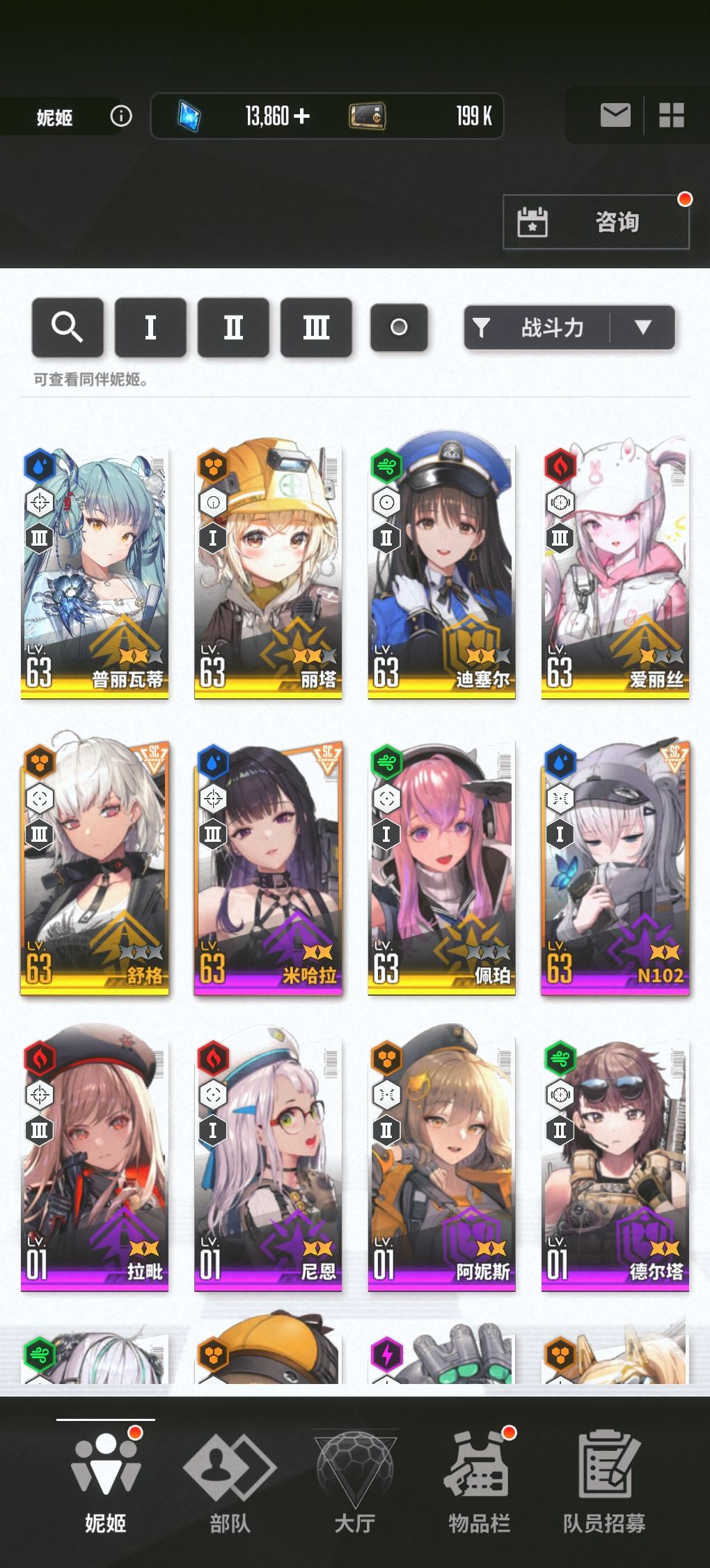 你可以看到我已经有了三个2星角色,那么我要突击检查了,心愿单填满了没有!心愿单没填满,妮姬就会随机乱出,而朝圣妮姬的概率不论你是否填满心愿单都不会变动,所以抽普票前请优先填满心愿单,因为开荒期的目标只有俩个,尽量推主线和搞5个三星妮姬突破160。