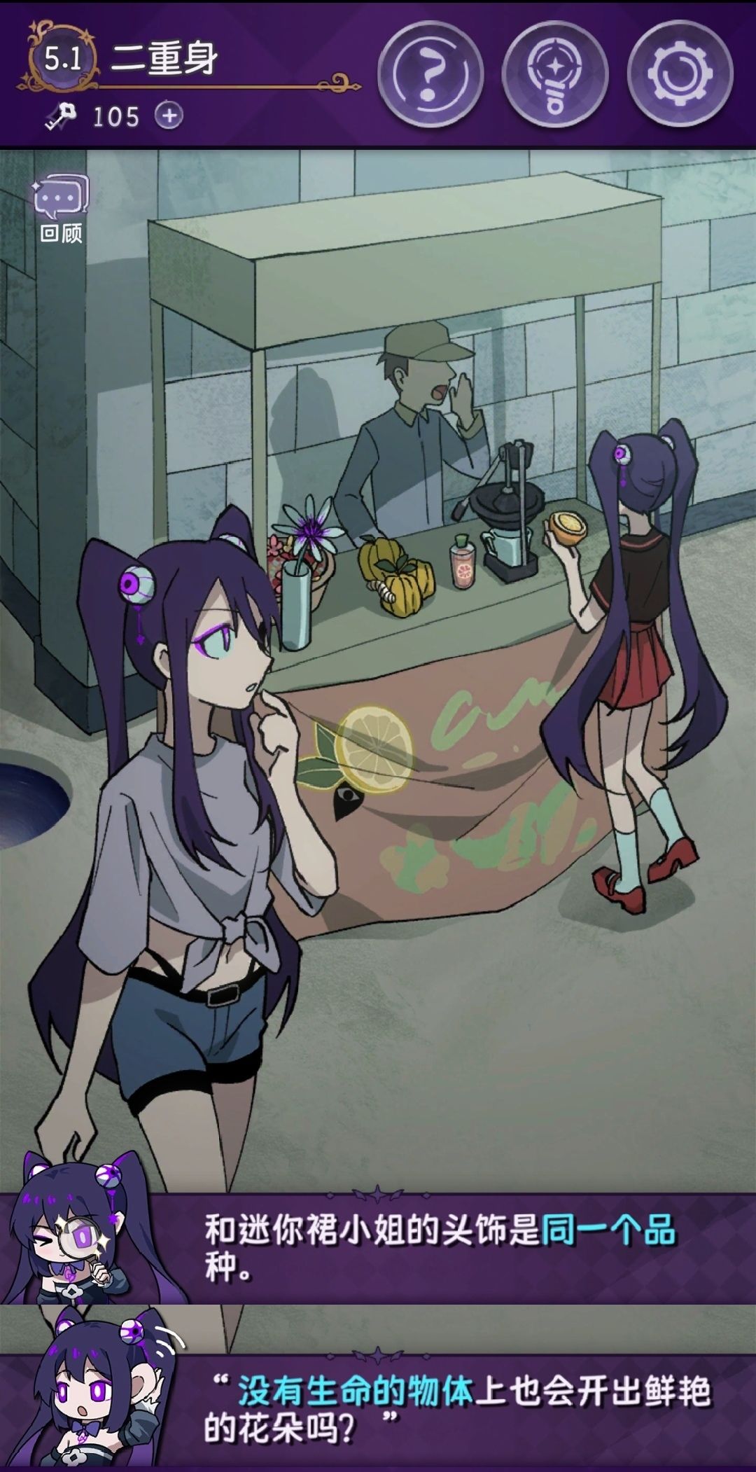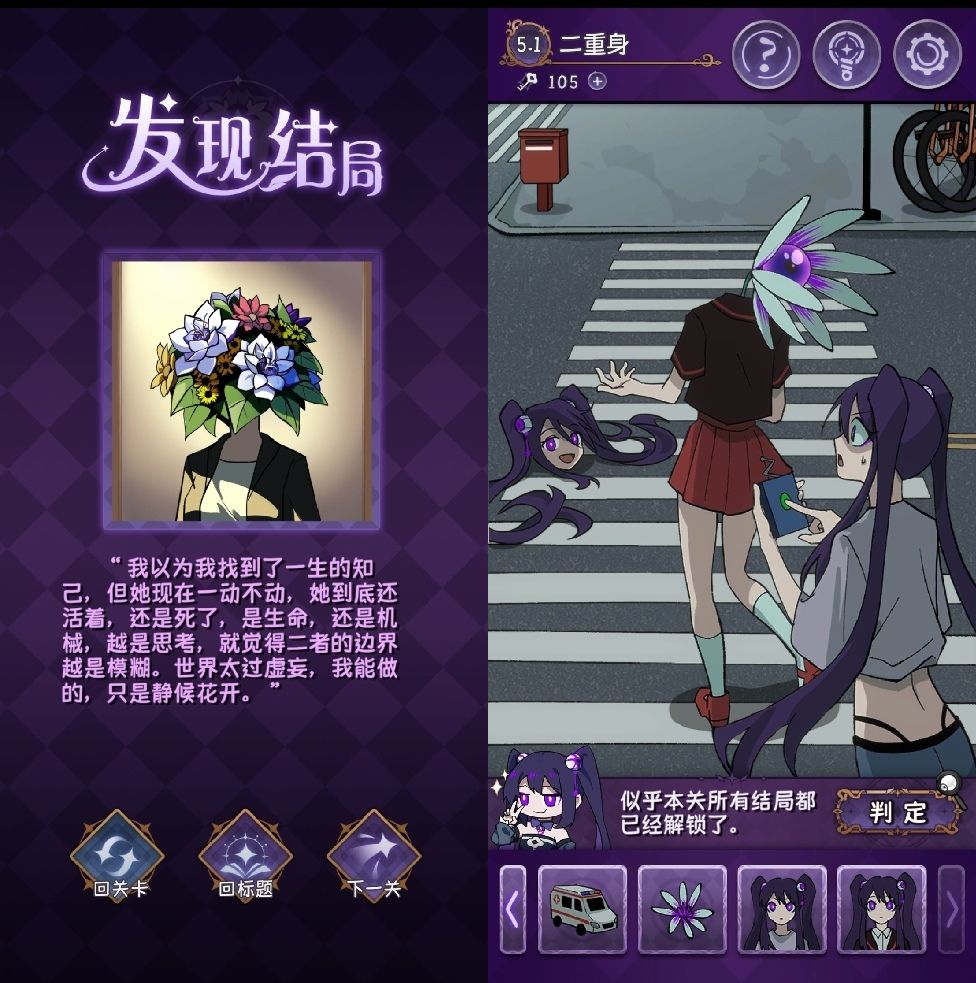 ③静候花开结局:两位小姐聊得十分投入,都把对方视为自己的知己。可是当裤小姐按下绿色按钮,裙小姐人首分离,只留下一朵玉珠莲。此生的知己终究是一场梦。(开放式结局,我没盘出为什么裙小姐会是机器人,只是想表达遗憾吧。)