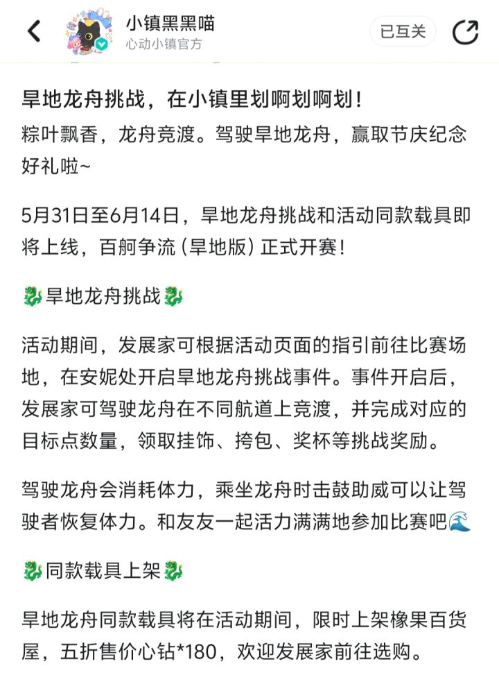 旱地龙舟同款载具将在活动期间,限时上架橡果百货屋,五折售价心钻*180。