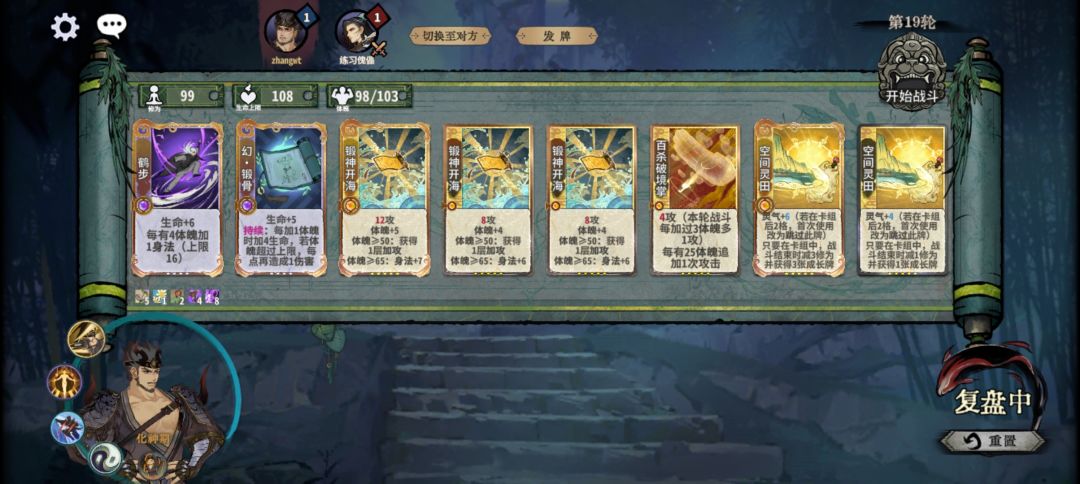 开局分支选择:先观察场上角色分布,如果非人机对手里面最多有1个不能用崩拳或者修玄解决的,可以放心的选择其他分支,去追求一个更加稳定的上分。可选的其他分支主要有+8次换牌,10命元2血,每次突破后+2血(其他的我可能还没遇到,遇到了再补充)。选其他分支之后就完全可以参考我以前的打法来(算是自己的一个舒适区)否则就选择未来卡-锻骨。以下仅讨论选择锻骨之后的打法。