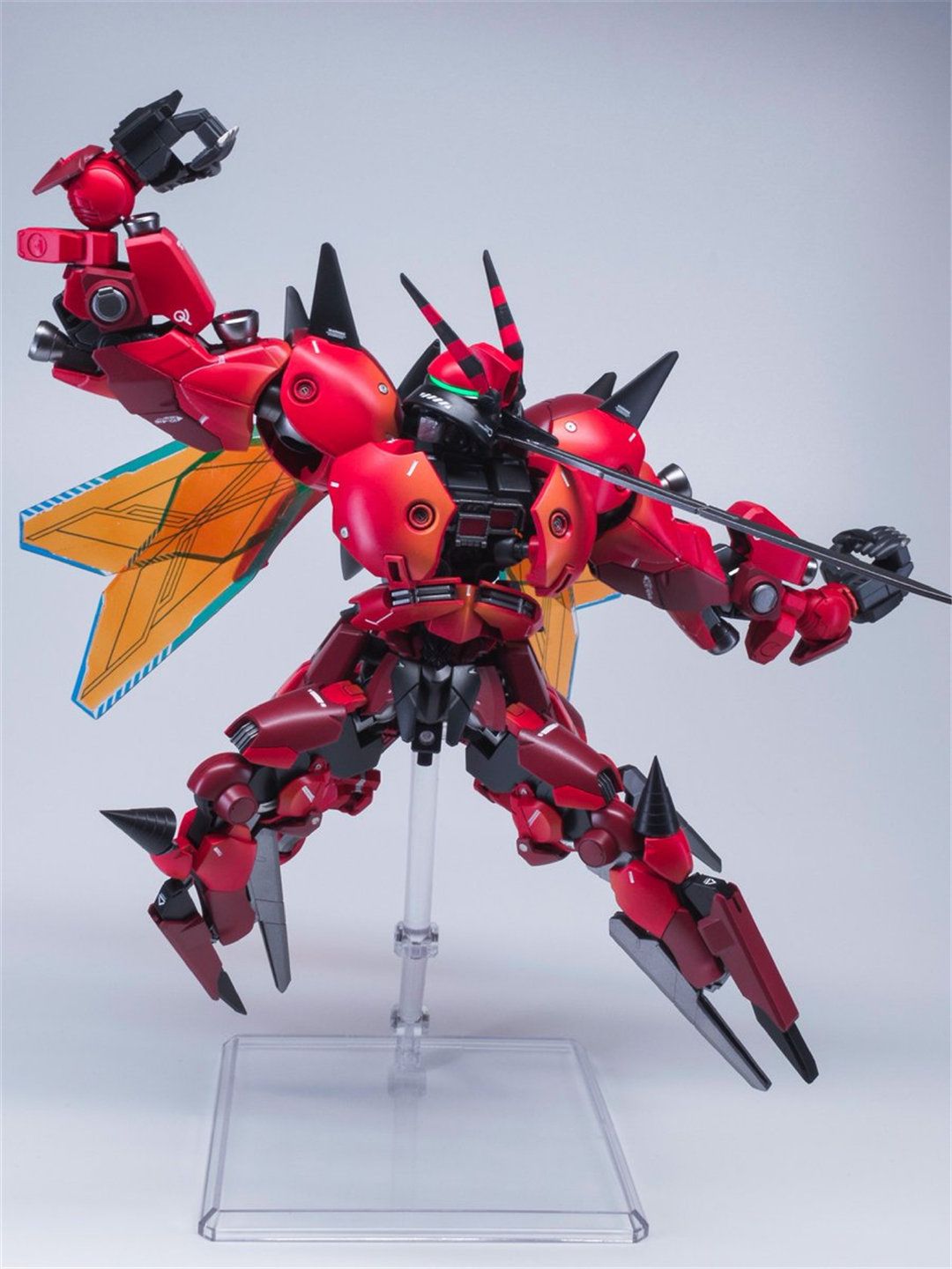 整个改造过程堪称艺术,先将零件切割打磨,调整比例以贴合爆肌蚊的昆虫体态,再用白色底漆覆盖原型,最后喷上标志性的血红色,点缀黑色条纹模拟肌肉纹理。原本棱角分明的高达装甲,被塑造成鼓起的肌肉块;肩甲的尖刺化作昆虫背鳍,关节连接件变成腿部关节,最绝的是头部,用透明件制作复眼,吸管口器则由光束军刀零件改造而成,机械质感中透着生物的诡异美感。