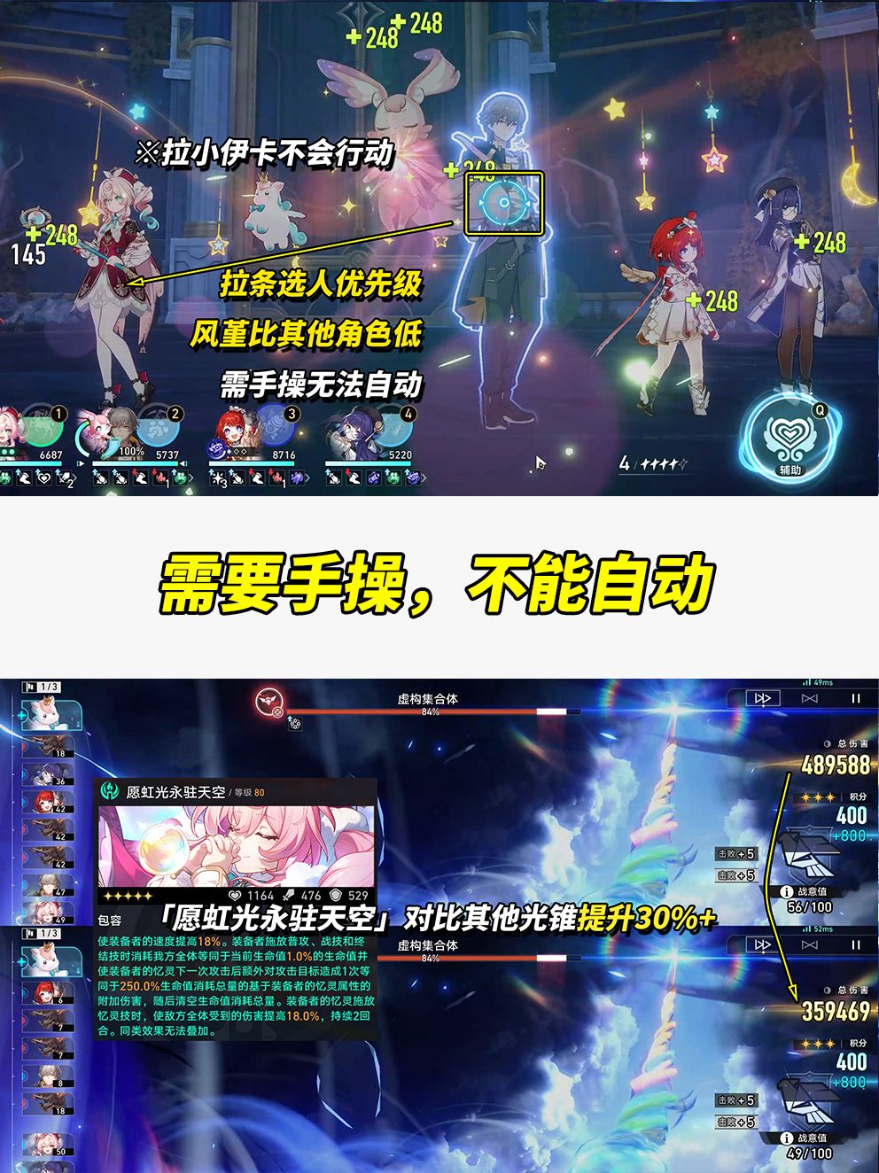 无光锥「愿虹光永驻天空」可以玩吗?玩是能玩,但上述提及的轮次、分数都得降一些。数值层面,主C风堇携带其余光锥伤害差距接近30%,如「将光阴织成黄金(阿格莱雅)」、「记忆永不落幕(黑塔商店)」、「让告别,更美一些(遐蝶)」。