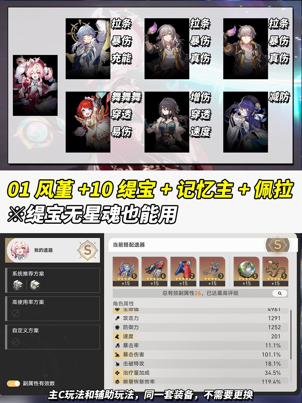 队友方面,记忆主、星期日、6魂布洛妮娅、缇宝、阮梅都挺不错。前面用佩拉,单纯为了压金让大家更容易复现。需注意,主C风堇需不断施放战技,耗点大,队伍战技循环需注意,双拉条挺废点。