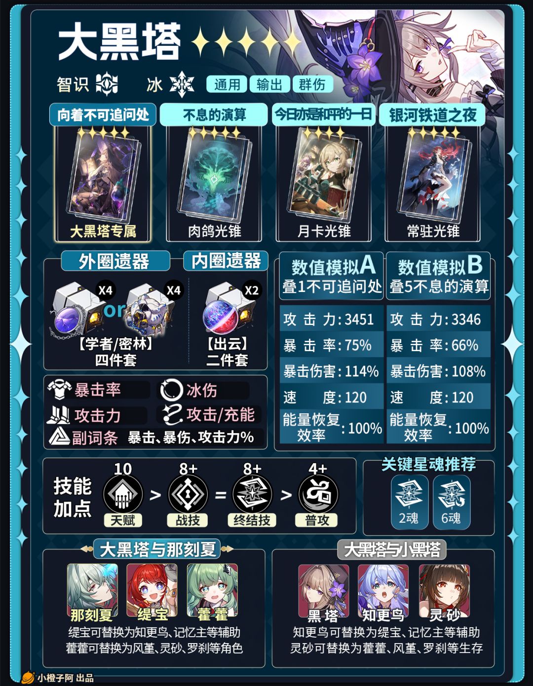 UID:104802274哈喽喽,这里是小橙子阿,本期是大黑塔的角色攻略!本篇将用图文形式讲解大黑塔的技能机制、光锥选择、星魂解析、遗器以及队伍搭配。谜题千千万万,但谜底却是…乌有之物。「大黑塔」是...