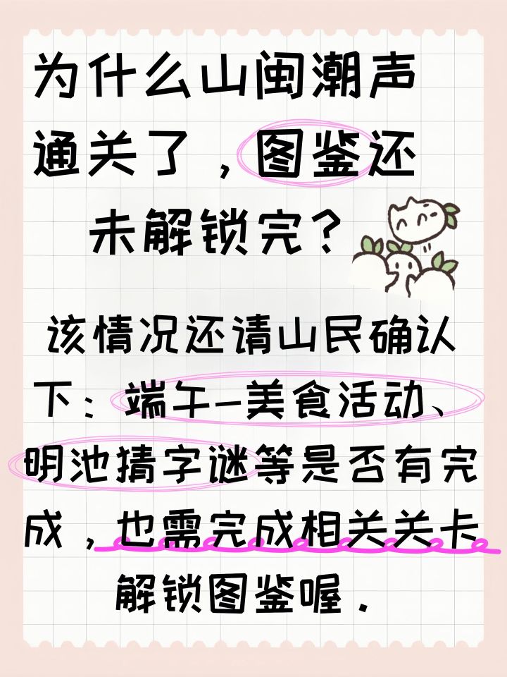 该情况还请山民确认下:端午-美食活动、明池猜字谜等是否有完成,也需完成相关关卡解锁图鉴喔。