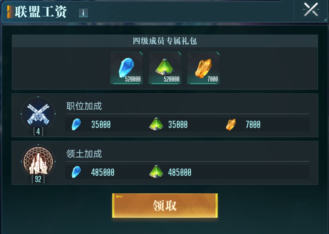 每日都会发放工资,职级越高和联盟占领的枢纽越多,获得的工资资源越多,工资后期可提供大量加成。