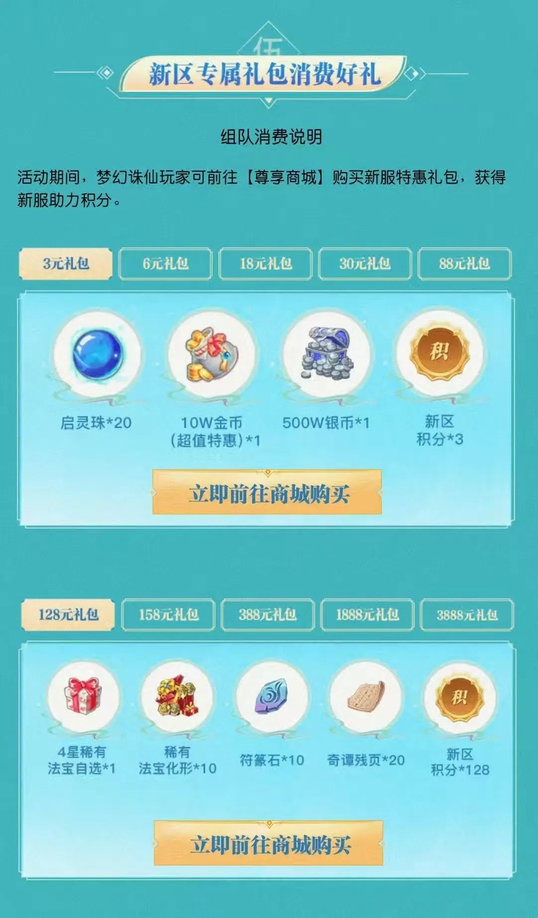 ④新区专属礼包:活动期间,组队成功的少侠们前往【尊享商城】购买新服特惠兑换券礼包,可以获得新服助力积分。
