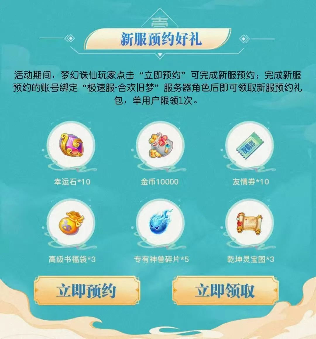 ①新服预约好礼:活动期间,完成新服预约,并完成预约账号绑定【极速服-合欢旧梦】服务器角色之后,即可领取幸运石*10、金币10000、友情券*10、高级书福袋*3、专有神兽碎片*5和乾坤灵宝图*3等好礼!注意哦,单用户仅限领取1次。