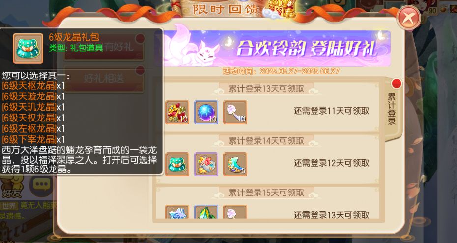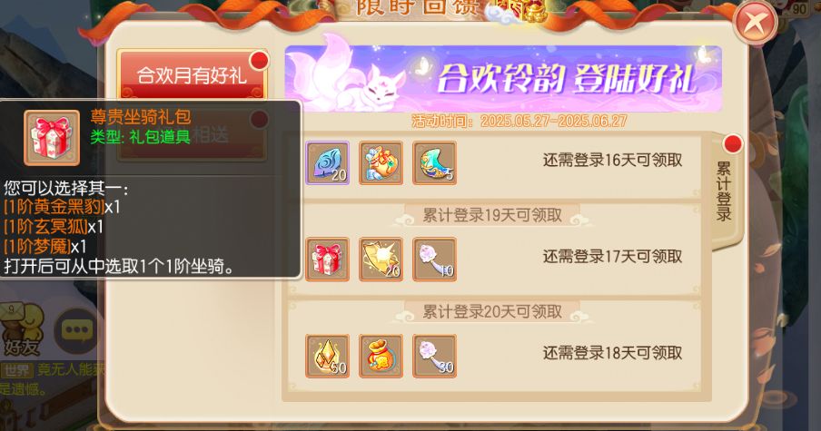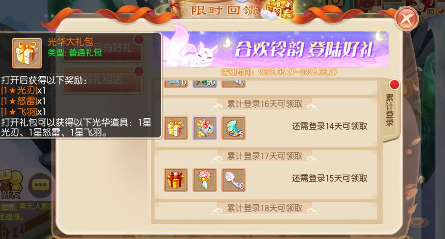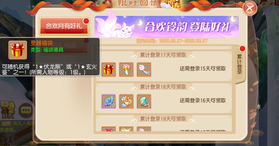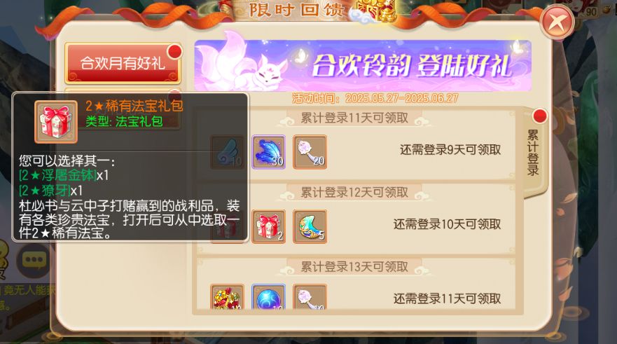从5月27日到6月27日期间,等级≥20级的少侠,每日登录就可以领取登录奖励,奖励将持续20天!超级书福袋、6级龙晶礼包、大量募灵玉、大量合欢铃韵、光华大礼包、2星稀有法宝、1星超能小小兔、1星桃花铃灵气附带、尊贵坐骑礼包等超值豪礼登录就能领哦!除此之外还有许多丰富的各类珍稀道具,在登录最后一天更有惊喜的神兽宝宝袋自选包送出!少侠们不要错过了哟~
