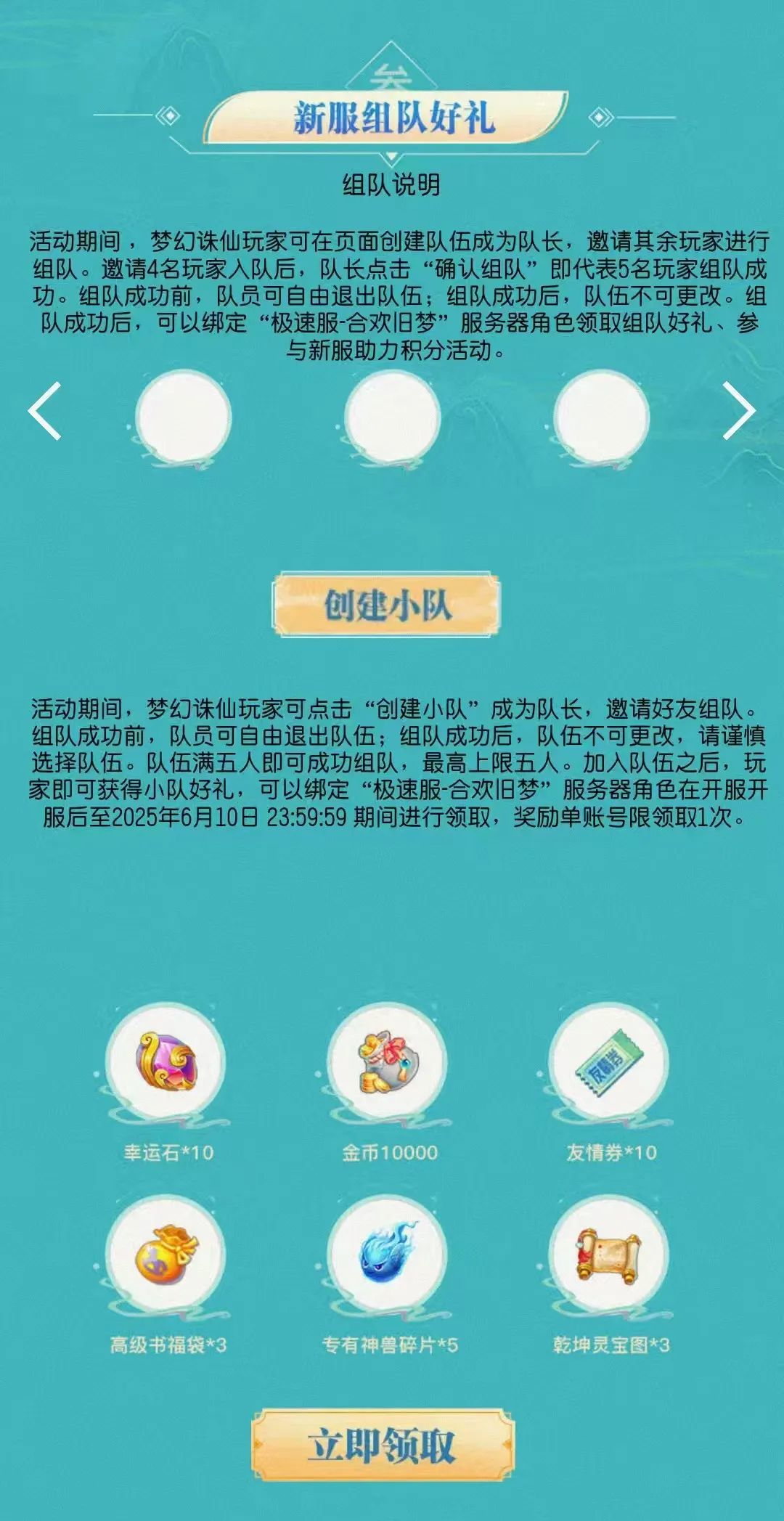 ③新服组队好礼:活动期间,少侠们可以在活动页面与其他少侠进行组队。当队伍成功集齐5人之后,即组队成功。在组队成功之前,队员可自由退出队伍;组队成功后,队伍则不可更改。届时只要绑定【极速服-合欢旧梦】服务器角色,即可在开服后至6月10日23:59期间领取组队好礼,注意哦,单个账号仅限领取1次。