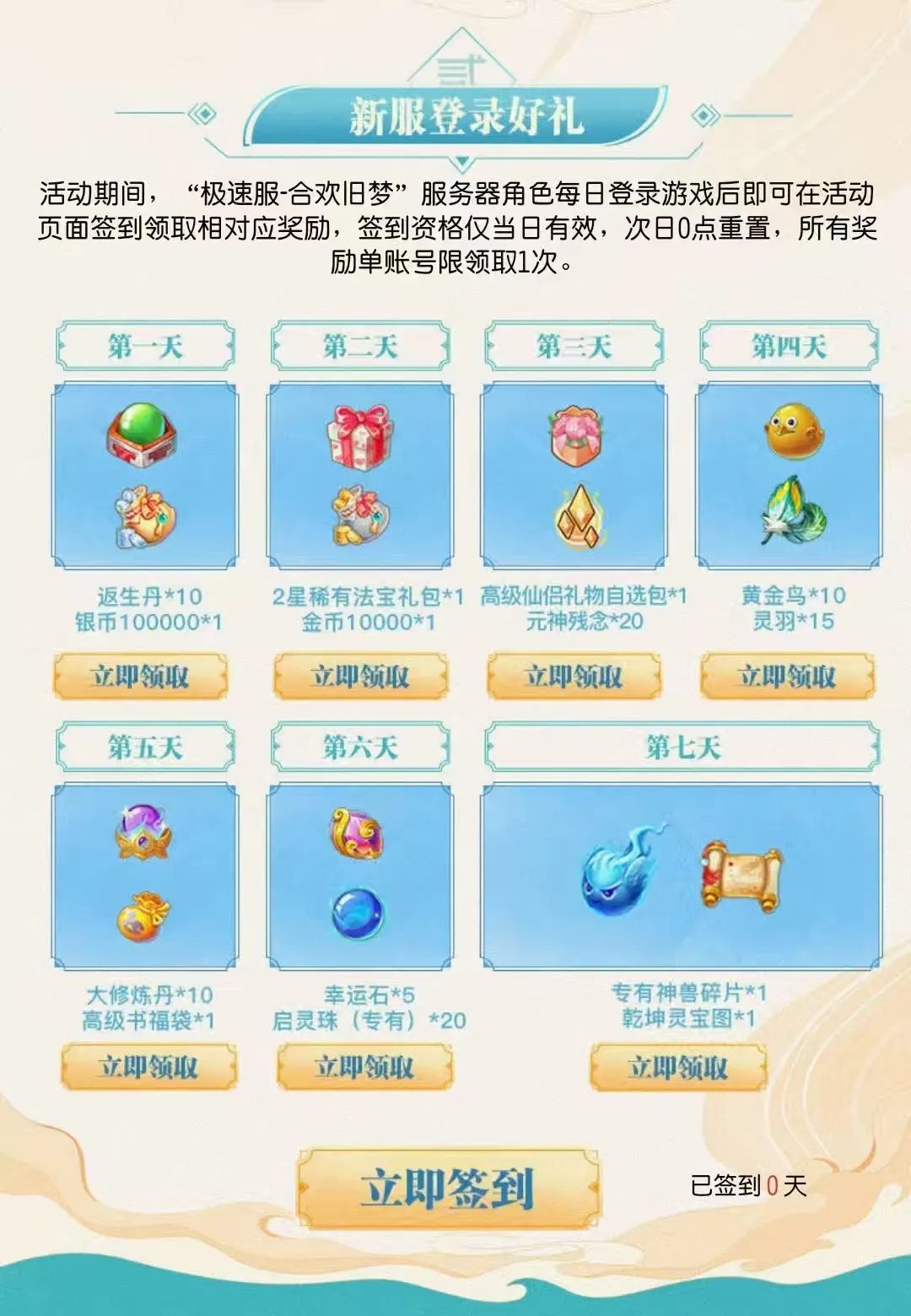 ②新服登录好礼:活动期间,【极速服-合欢旧梦】服务器角色每日登录游戏后,即可在活动页面进行签到并领取相对应奖励。签到资格仅当日有效,次日0点重置,所有奖励单账号仅限领取1次哦!