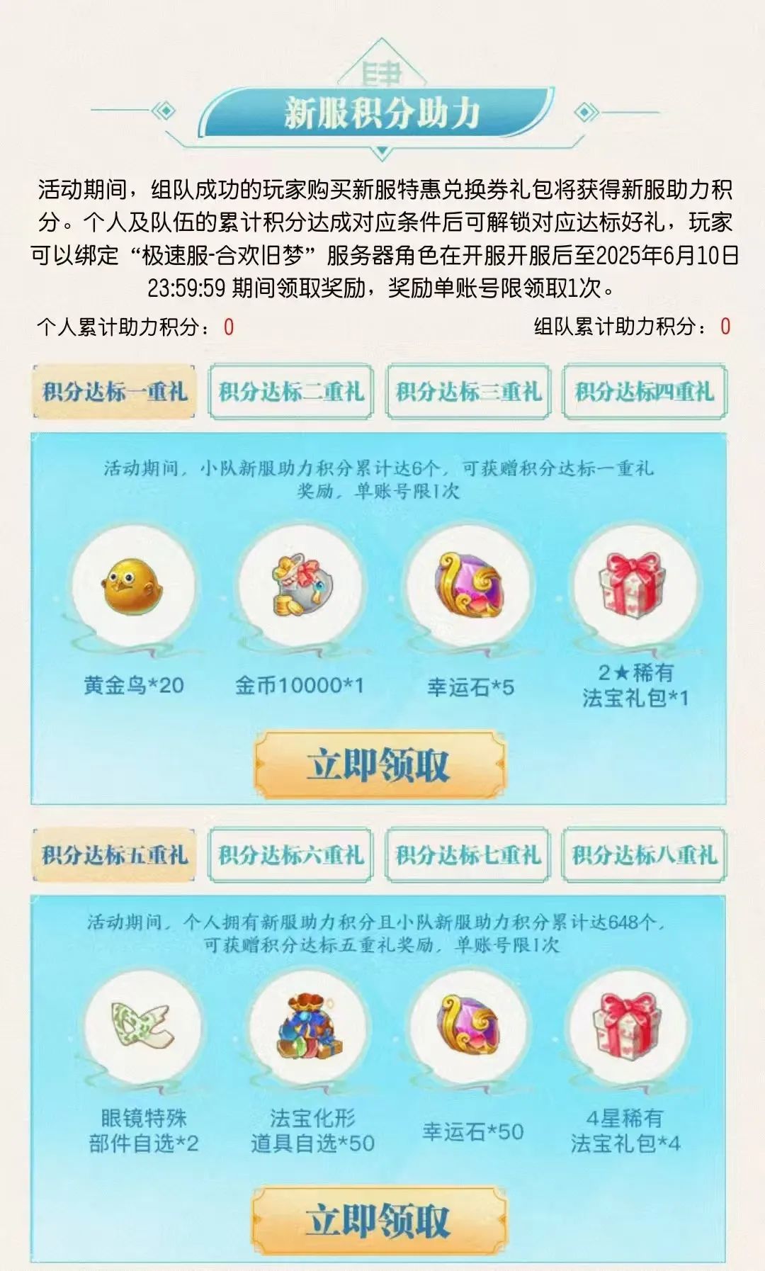 ⑤新服积分助力:当组队成功的少侠通过购买新服特惠兑换券礼包,获得的个人及队伍累计积分后达成对应条件,即可解锁并领取对应好礼!礼包领取时间为开服后至6月10日23:59。单账号仅限领取一次。