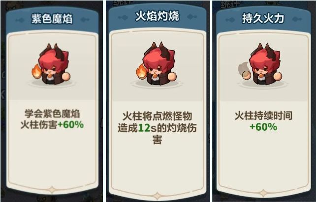 火焰法师主推荐选择【增伤】【灼烧】【持续时间】,【爆发】词条做次选择,有机会选到增加概率卡,伤害加倍!