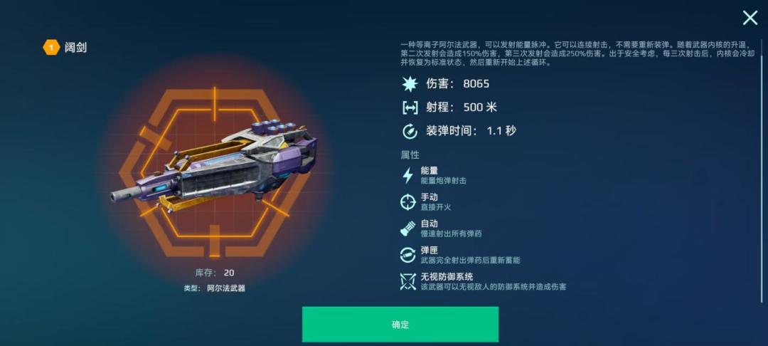 其内置武器的“电磁脉冲效果”可有效阻止对手技能及主动模块效果的触发(例如:抑制因陀罗的虚化能力、阻断贝德维尔的决斗机制、瓦解修复模块的治疗效果等),只要通过率先发动攻击,抢到先手,即可有效削弱敌方的生存能力与反击手段,为己方创造战术优势,协助队友单位摧毁敌方目标。