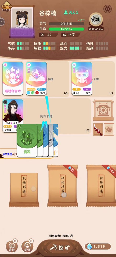 初始卡,需要刷一个遁术25%逃跑率,或者20的都行,带一个玄的词条伙伴