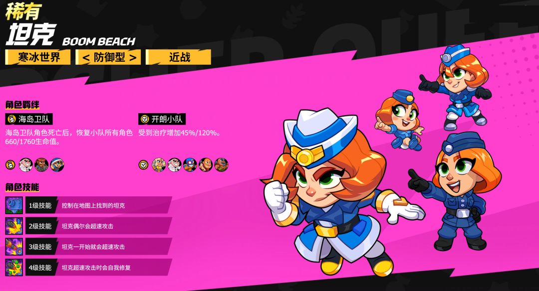 坦克是一位到达寒冰世界后可以解锁的防御型角色,拥有海岛卫队和开朗小队两个羁绊。