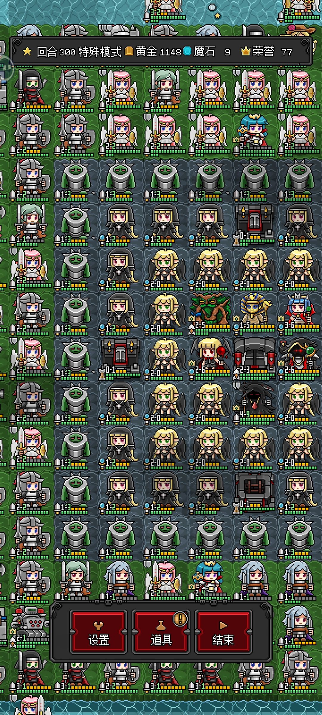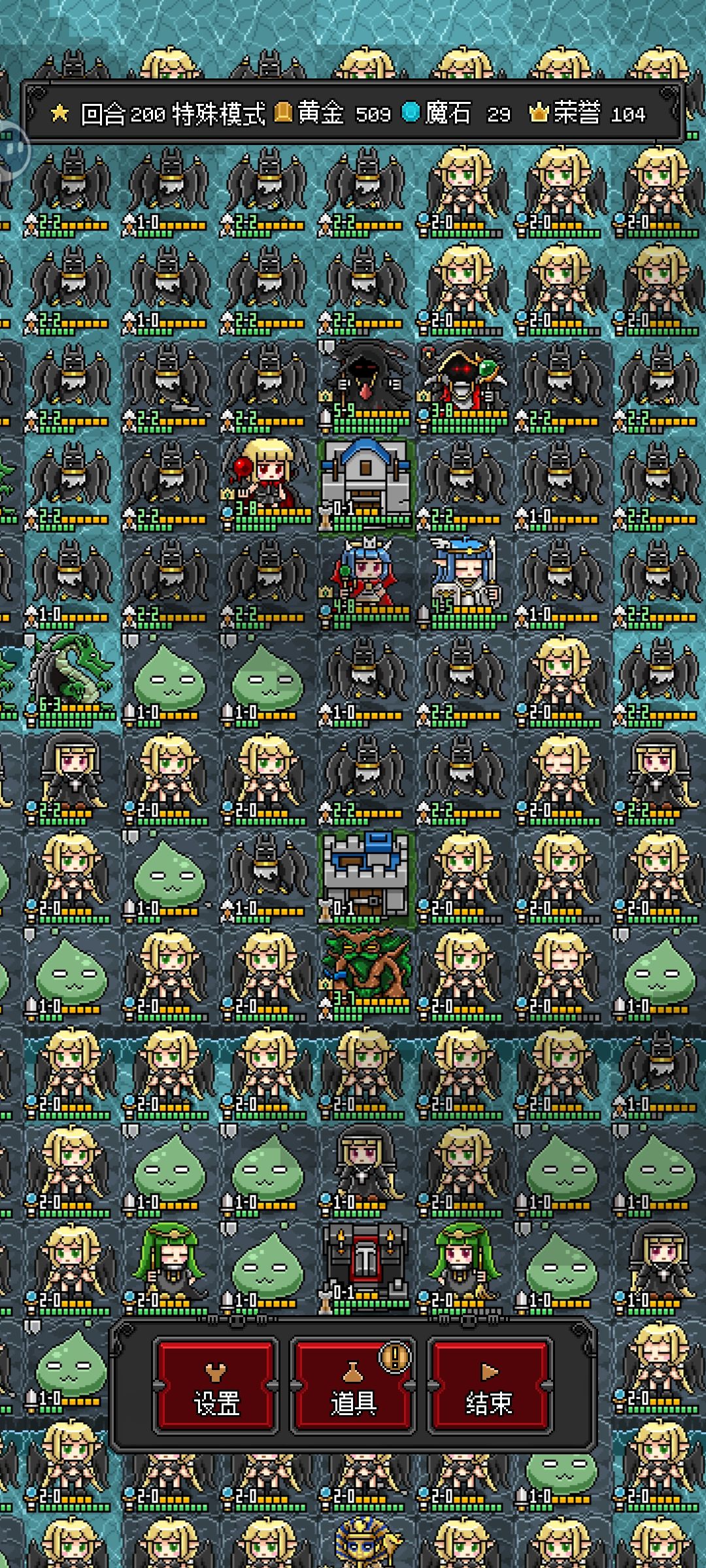 魔王城保卫战:这关比较恶心,对面新出的小怪能直接压死你的怪,但是英雄不会被压,所以6个英雄全部缩到基地,德古拉把周围敌人全部变鸡,树精回血,成型后可以把3行动的鸡打掉换成2行动鸡,另外鸡好像也是有技能的,那些技能恶心的就直接打掉别变鸡,成型后树精不断奶就可以一直苟住,参考3图