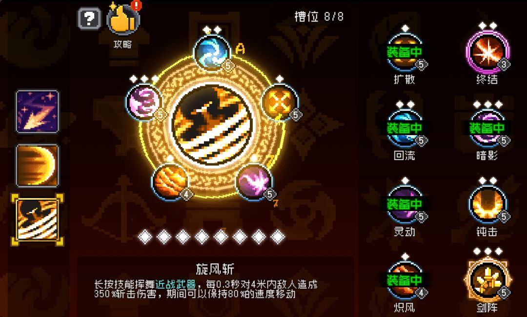 旋风斩专精中扩散、暗影和回流必带,剩下两个位置选灵动或钝击