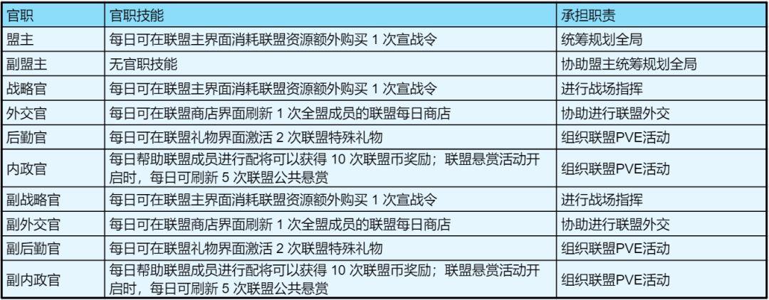 联盟内拥有以下官职,具体作用如下: