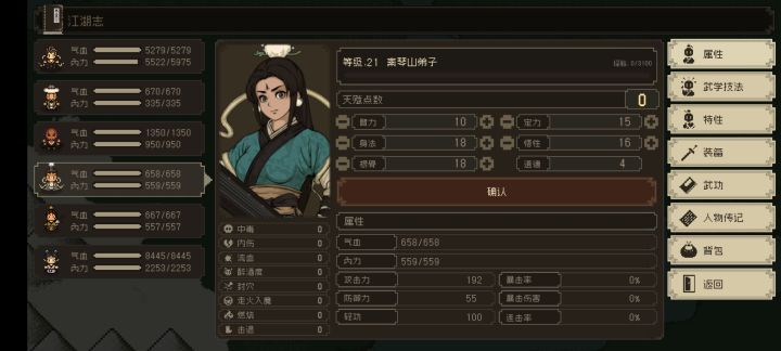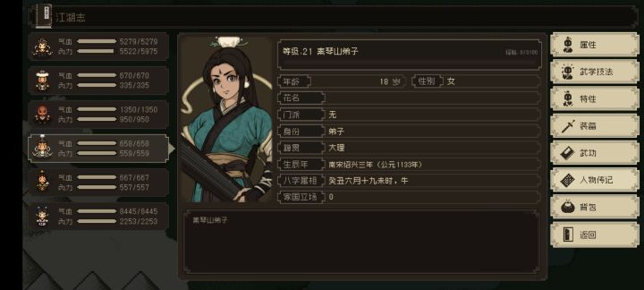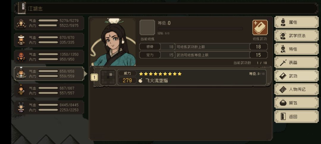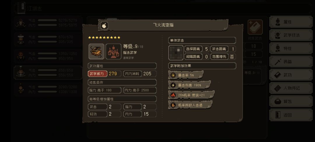 悟性始终高于5,无特性,自带武学九颗星飞火流空指。